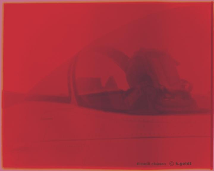Eine orangerote Farbfläche mit einer nicht sofort zu dechiffrierenden Grafik, dazu elektronische Soundflächen auf der Tonspur: falcon beginnt mit einem starren, visuell fesselnden Bild. Bald verändert sich dieses: die Farbe wechselt zu Rosa, über Weiss, Gelbgrün zu Orange und Rot, parallel zum vibrierenden Soundtrack. Verschiedene Bildteile werden von diesen Farbmodulationen erfasst, wodurch sie in unterschiedlicher Intensität hervortreten. So wird erst nach und nach deutlich, dass das seltsame Zeichen das abstrahierte Bild einer Flugzeug-Kanzel darstellt: denn falcon bezeichnet im Englischen nicht nur einen Raubvogel, sondern auch die F-16, einen Kampfbomber.