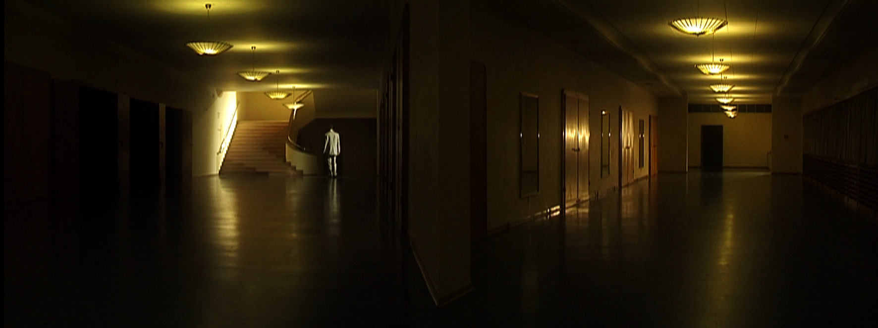 Auf das ungewohnte Terrain der eigenen Inszenierung wagte sich das Künstlerpaar mit Mirror (2003). Zumindest Christoph Girardet hatte zuvor fast ausschließlich mit „Found Footage“ gearbeitet. Mirror entstand vor Kristall und entfaltet bereits dessen Thematik: Das Spiegelmotiv und die Paarsituation. Gedreht wurde an vier Tagen in einem Bielefelder Konzertfoyer, dessen Atmosphäre durch ein nostalgisches Ambiente geprägt ist. Die Künstler ließen sich von einem Ausspruch Michelangelo Antonionis inspirieren: „Die Personen einer Tragödie, die Orte, die Luft, die dort geatmet wird, sind manchmal fesselnder als die Tragödie selbst, ebenso die Momente, die ihr vorausgehen und ihr folgen, wenn die Handlung stillsteht und die Rede verstummt.“ Im Dunstkreis der Abendgesellschaften von Antonionis „Die Nacht“ und Alain Resnais´ „Letztes Jahr in Marienbad“ präsentiert Mirror einen erstarrten Frauen-und-Männer-Reigen in unbewegten Tableaus. Es geht um Beziehungen, um die zu acht Minuten gedehnte „split second“ im zeitlichen Niemandsland zwischen Trennung und Gerade-noch-Zusammensein. Dieser zwischenmenschliche Wackelkontakt wird in der Lichtregie durch ein beständiges Glühbirnenflackern unterstrichen, das Figuren und Interieur im Vorder-, Mittel- und Hintergrund miteinander verbindet und gleichzeitig trennt. Bewegung findet eigentlich nur in den Augenmuskeln des Betrachters statt. Aber trotz des weitschweifig-breiten Scope-Formats beruht auch die Panoramawirkung der Bilder auf einem Trugschluss. „Scherzeshalber nennen wir unser Verfahren ‚Cinemascope für Arme’“, erklärt Girardet. Das Breitformat wurde aus jeweils zwei Teilbildern so zusammengesetzt, dass ein Raumkontinuum simuliert und gleichzeitig gebrochen wird. In der Bildmitte ist stets eine haarfeine Sollbruchstelle spürbar; selbst frontale Großaufnahmen einzelner Gesichter sind auf diese Weise sich selbst entfremdet. (Jens Hinrichsen)