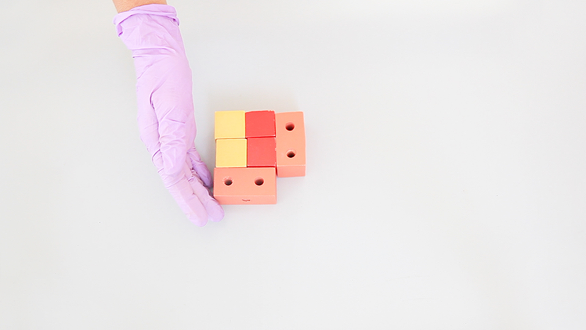 Der Eindruck des Spielerischen verliert sich geschwind. Zwar sind die hölzernen Klötzchen leuchtend und bunt wie Bonbons, aber die Hände, die die Objekte für die Kamera immer und immer wieder neu arrangieren, stecken in Gummihandschuhen. Das Unaufhörliche von Stapeln und Reihen, Drehen, Wenden und Verschieben hat etwas von einer rastlosen Suche nach der "richtigen" Konstellation.
