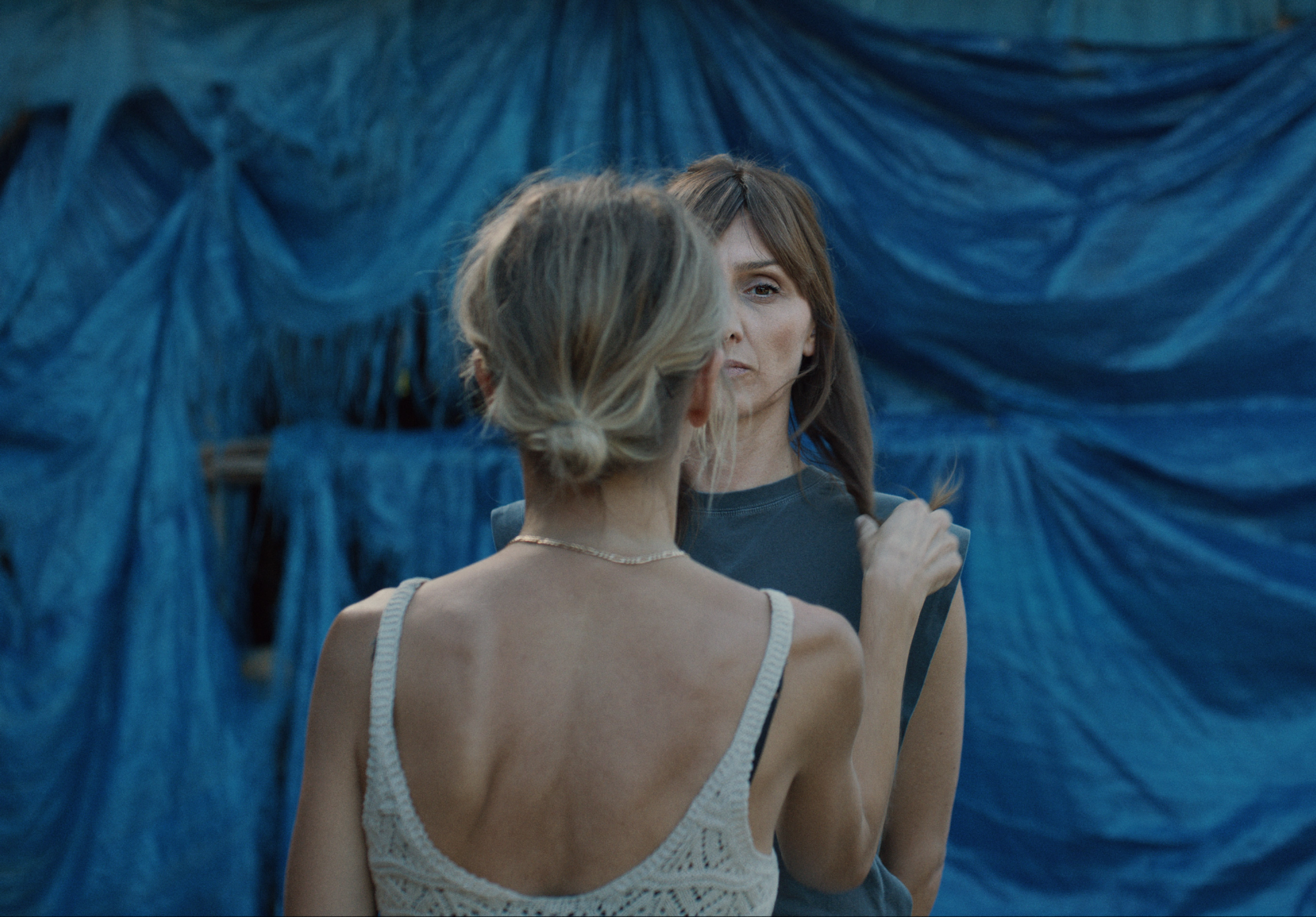Katatonie und choreografierte Bewegung, ‚blutende‘ Sauerkirschen und Fleisch: In dem mit symbolisch aufgeladenen Motiven ausgestatteten Stressraum treffen Fließkräfte auf Stasis und Zeichen verknüpfen sich zu Assoziationsketten. Die Grenzen zwischen Gegenwart und Vergangenheit, Realem und Geträumten, Ich und Du sind unscharf gezogen, auch Dokumentation und Fiktion fließen ineinander. Trauma Fiction, mit Mutter und Töchtern in den Rollen ihrer Alter Egos.