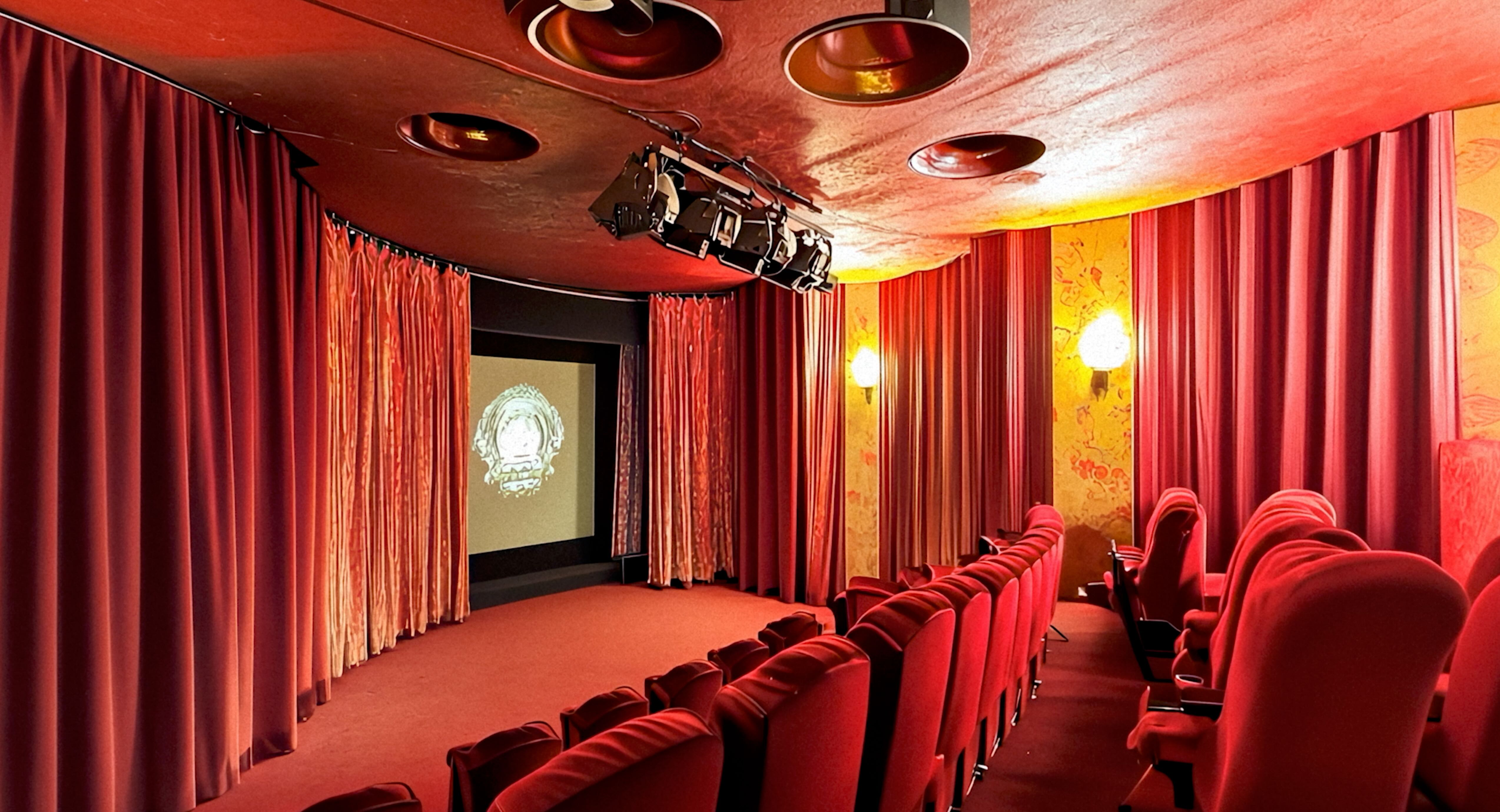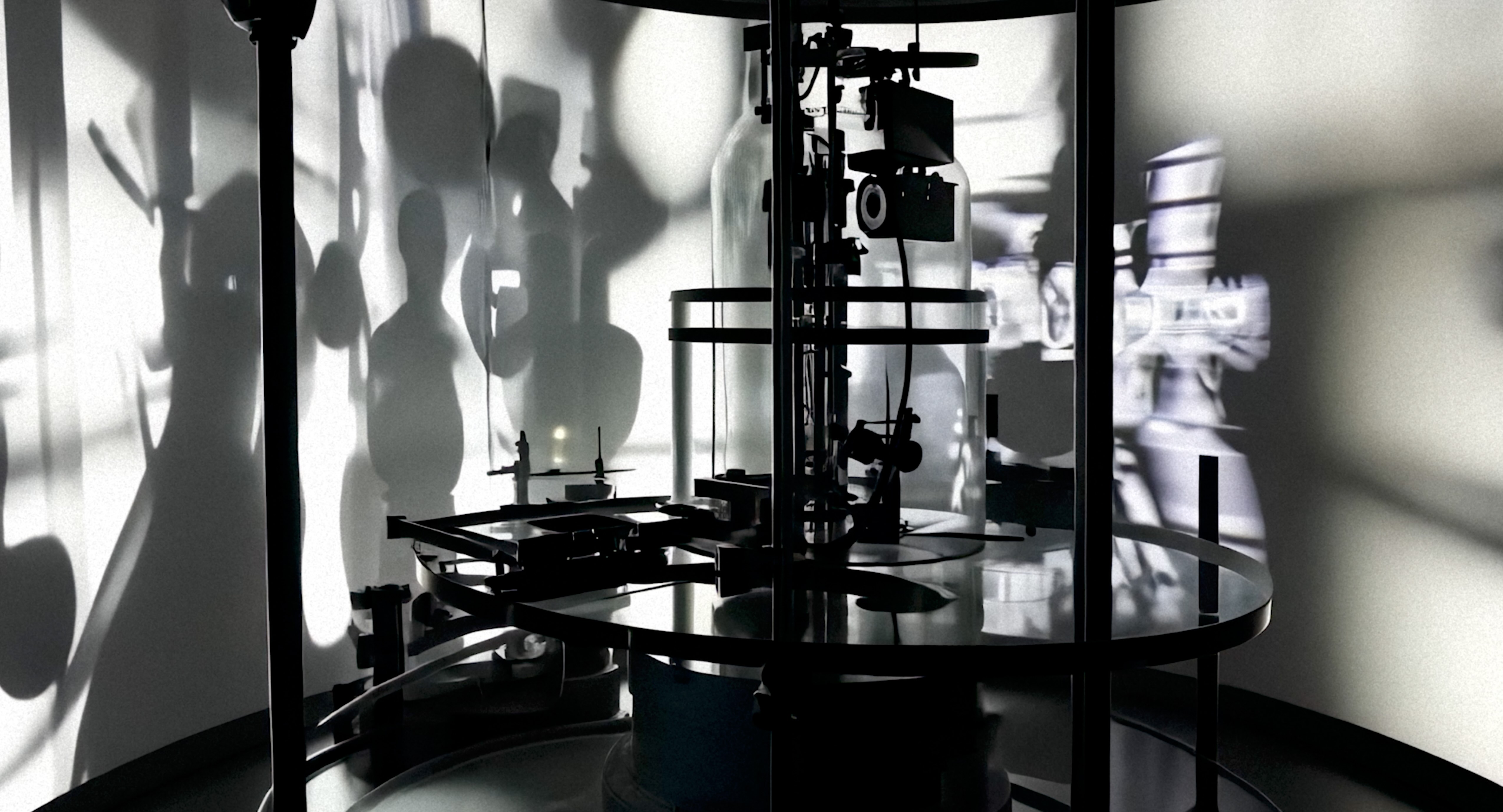 Es rattert und knattert. Man hört das Surren eines Projektors, das Klicken alter Kameras. Der Raum ist im Wandel, Fragmente verschränken sich, Vorhänge gleiten auf und enthüllen stetig neue Ansichten auf filmische Apparaturen und den Kinoraum – oder ist es die Vorführkabine? Wo sind die Besucher*innen? Schattenspiele erinnern an Film Noir, zerfließen sogleich und morphen zu lebendig wirkenden Silhouetten. Und zuletzt erscheinen die Besucher*innen dann doch. Statt auf die Leinwand blicken sie gebannt in ihre VR-Brillen. Der Kinosaal wirkt wie ein Relikt aus der Zukunft: vertraut und zugleich uncanny.