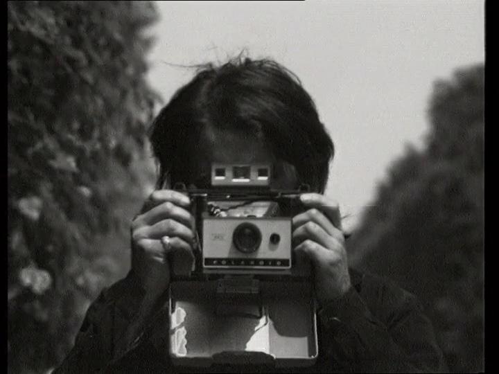 “An instant-camera and a TV camera are placed opposite one another. They operate at the same time: The actor takes photographs with the Polaroid camera, the TV team films. When shooting the picture (click!) the TV team’s camera stops. The time taken for the development process of the Polaroid photograph, approximately 20 seconds, is recorded by the TV camera: approximately 20 seconds of black film appears on the screen. The TV camera begins filming again just at that moment at which the actor takes the Polaroid photograph out of the housing. The picture is then developed as a close up: One can see the TV team on the Polaroid photograph. A continuous live tone is added to this. A reversal, a structural layering, a loop. The product shows the process. Jacques Lacan: ‘Accordingly, human language constitutes a communication, in which the sender is returned his own message by the receiver in a reversed form’.”