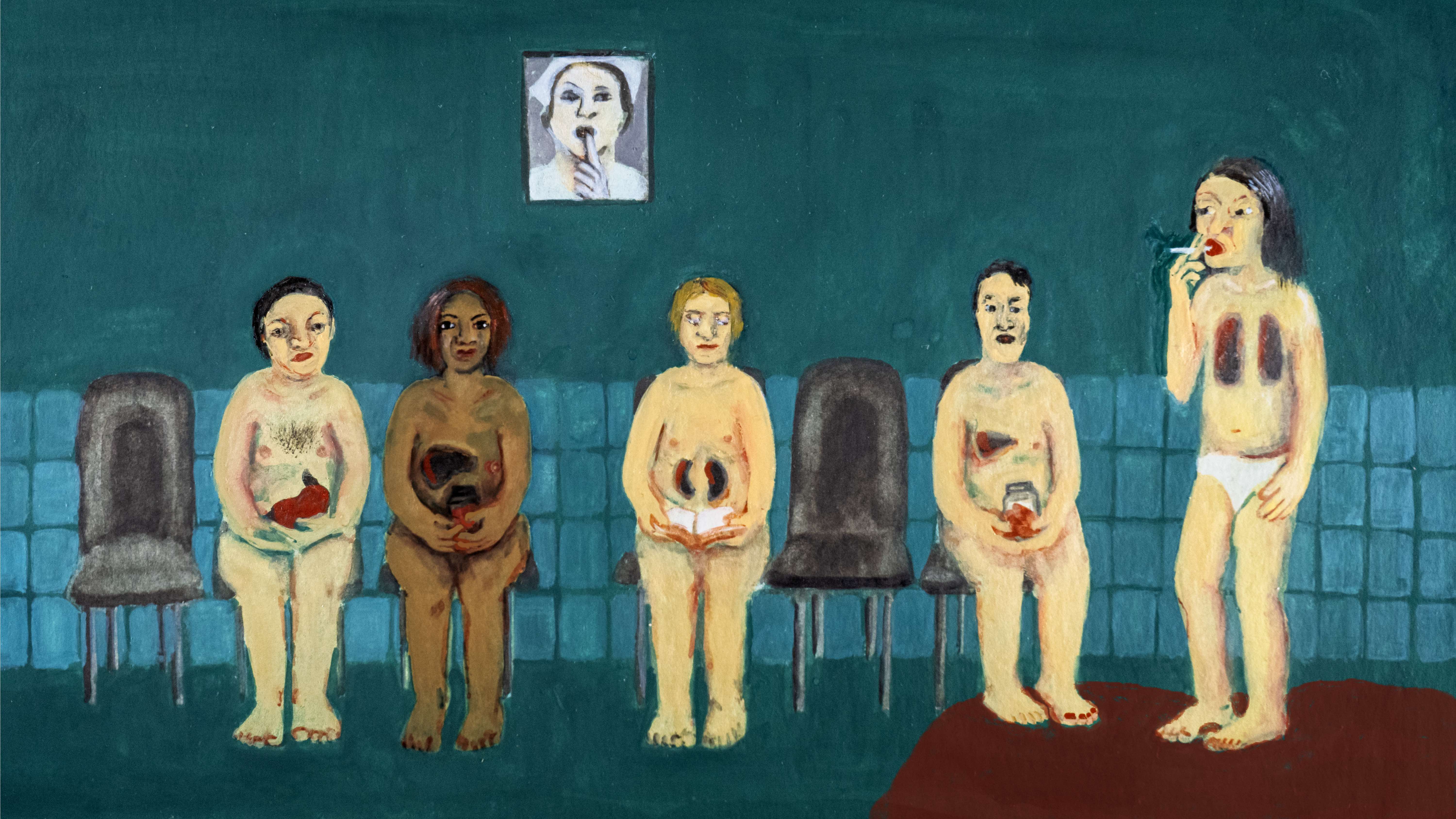 "The heart is just a burden." This is what – in the first of the film's three dialogues – a doctor tells Tako Tsubo's protagonist, Mr. Ham. This minimalist animation short, an image/text-symbiosis by Eva Pedroza und Fanny Sorgo, is as pithy as it is painterly and pointillistic. Its title comes from the Japanese name of a stress-related cardiomyopathy. So, without much ado, Mr. Ham has his heart removed in an operation. The lapidary course of events fits the wilfully odd world designed in Tako Tsubo: In a forest – the soughing of which comes across in fluttering drawing – people are naked and talk without much sound. At times, the laconic weirdness is punctuated only by the blinks of eyes and the twitches of mouths.